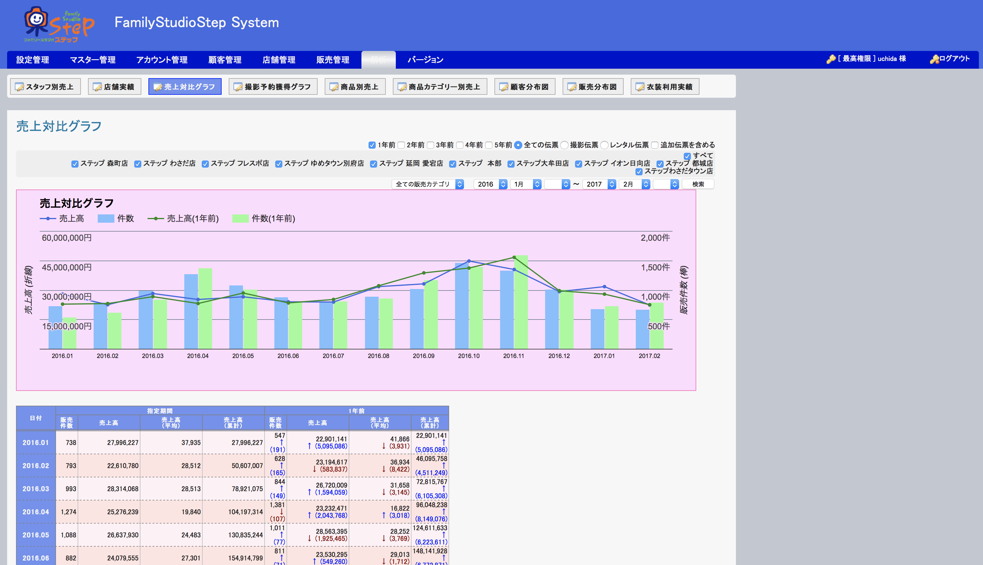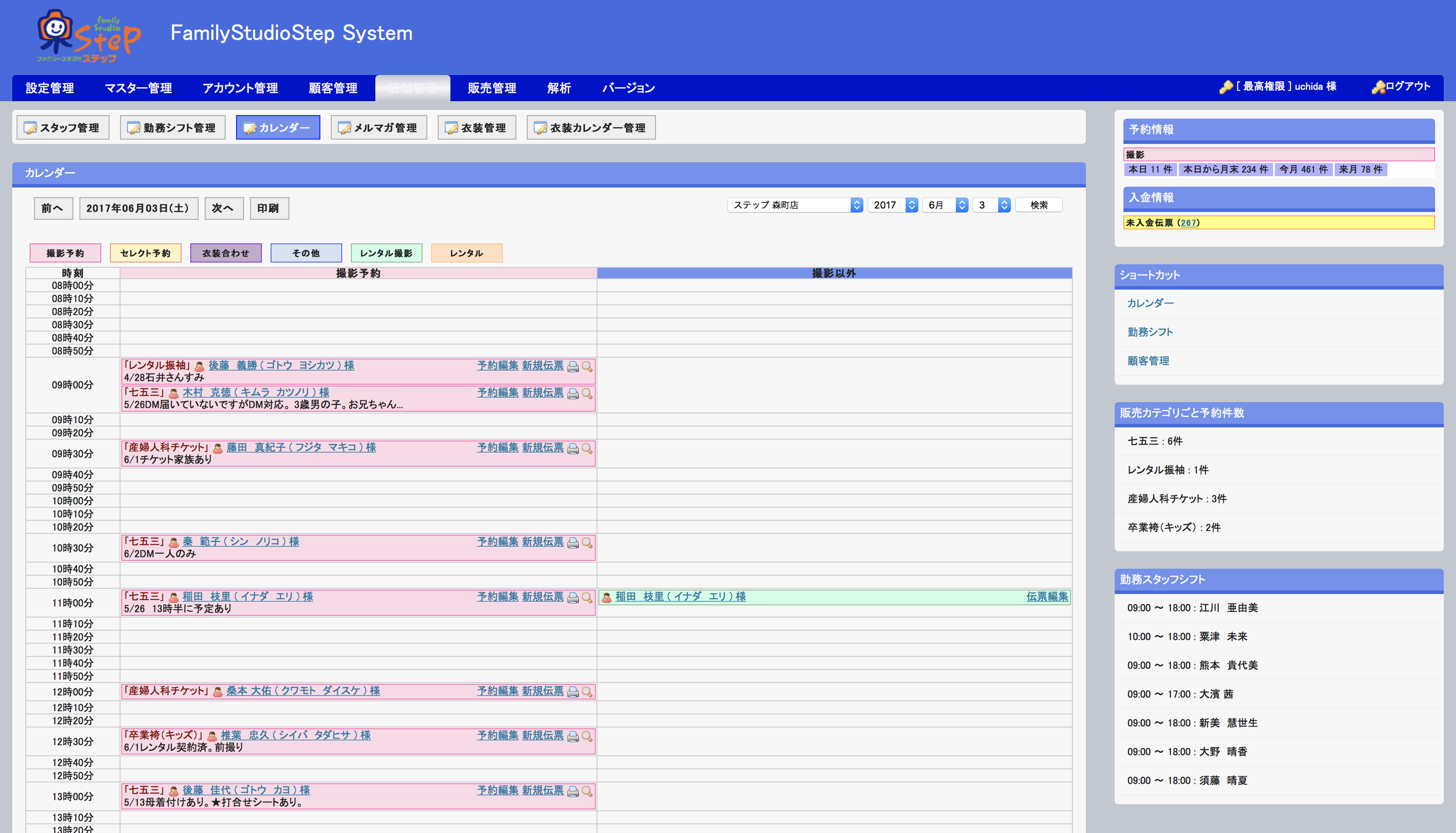 | 顧客管理 | 販売管理 | スタッフ管理 | 勤務シフト | 予約管理 | メルマガ配信 | 伝票発行 | 衣装管理 | 入金管理 | 売上解析 |